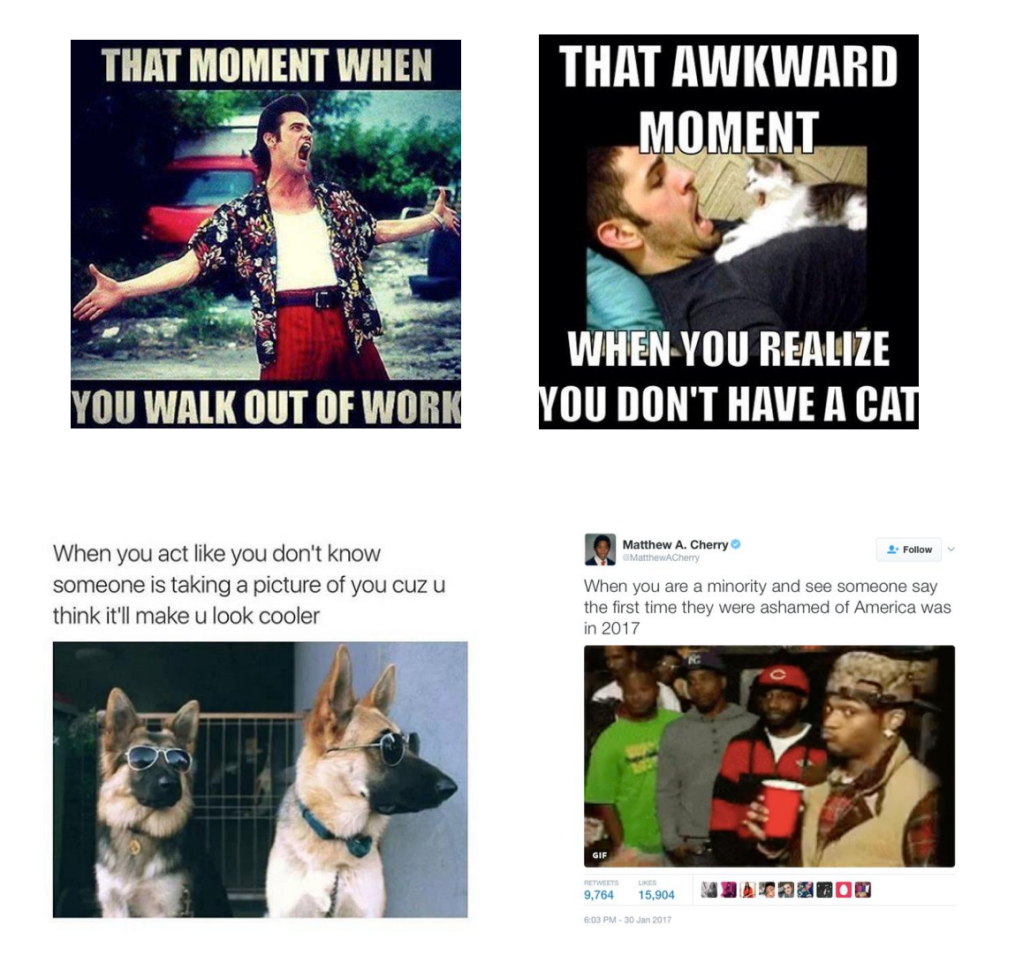 Moreover, even though there is very little common between the Jim Carrey meme and the one with the man his cat, it is perceptible that they belong to the same genre of internet memes. This is nothing to do with the script and the image of each meme, or even the meaning of the combined whole. What is common between them is that they both relate to the expression of some exaggerated emotion in a temporal instance connotated by the ‘when.’