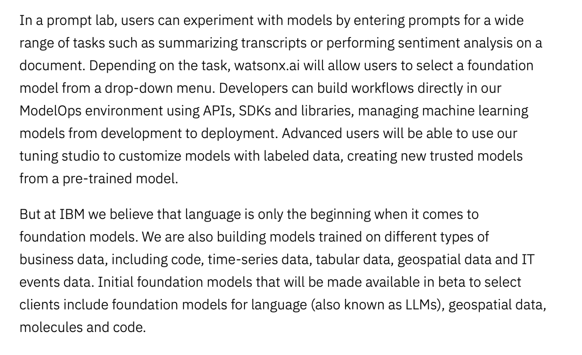 Another example is from below: a screenshot of how companies put IBM’s Watsonx.ai, IBM’s next-generation enterprise studio for AI builders to train, validate, tune, and deploy AI models.