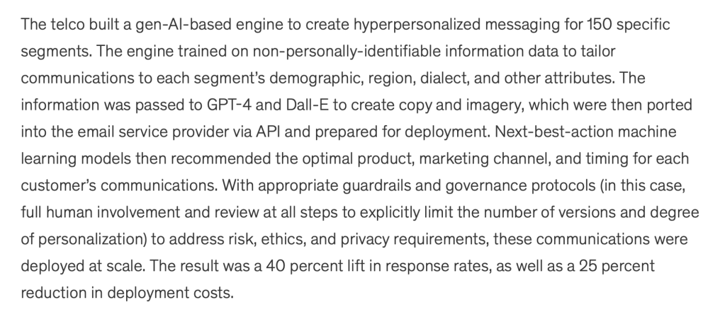 Here’s a great example of what such end to end AI agent workflows look like from McKinsey here about an European telecommunications company using customised GenAI workflows for marketing outreach.