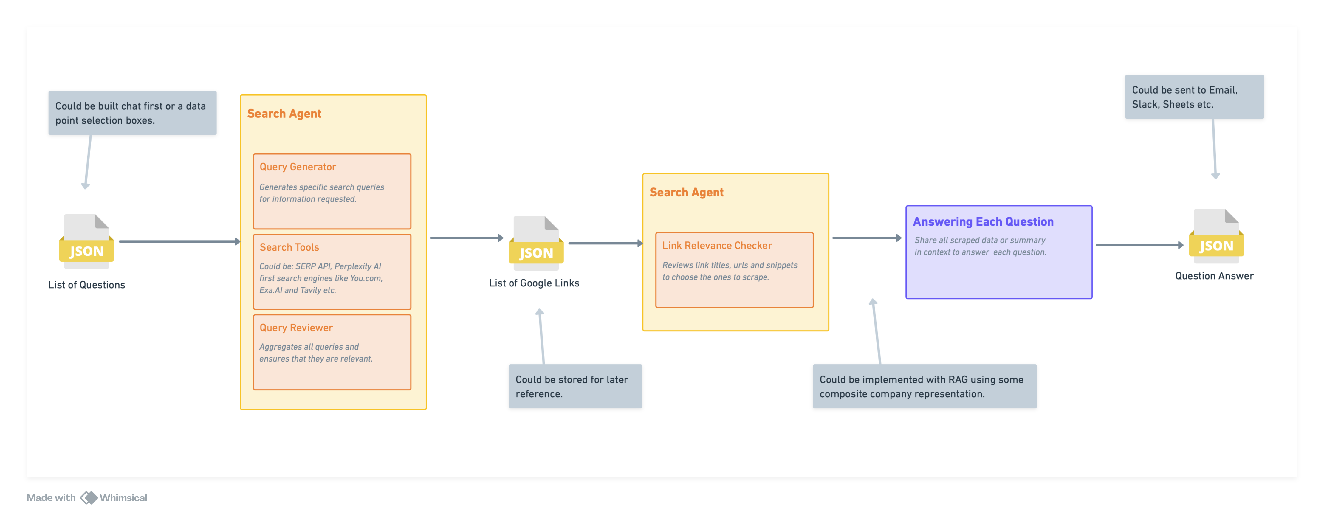 - The input is a fixed set of questions you want the AI workflow to answer for a company.