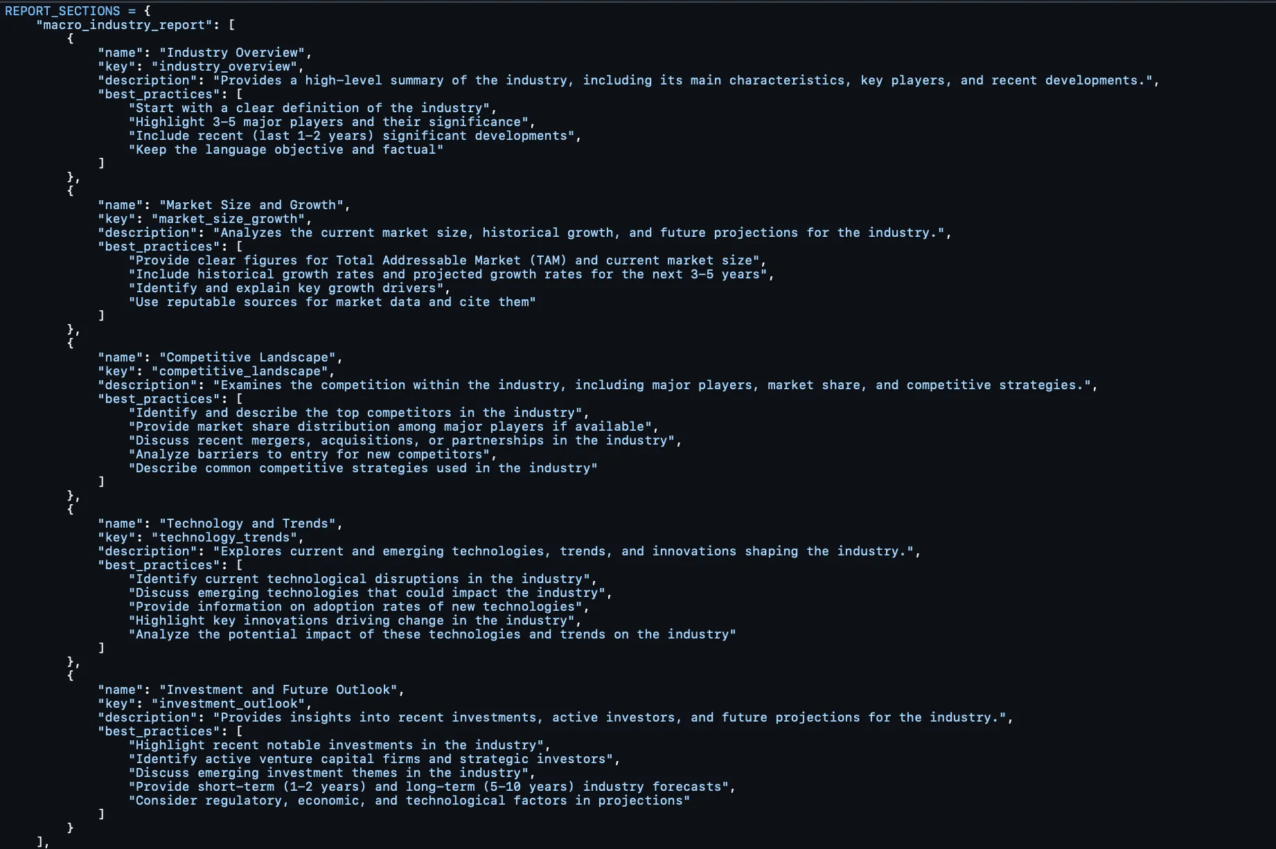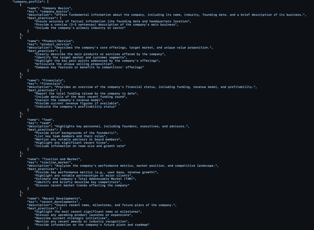 What I liked about my approach back then was building out the report output – not as one static template inputted into a prompt window – but as a dictionary – not only of report formats – but at the level of sections.