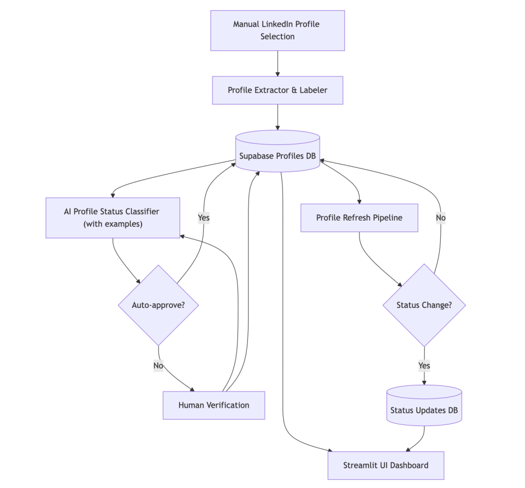 The technical implementation involved enhancing the profile refresh pipeline to detect meaningful status changes and store them in a separate updates table. Each alert would capture the change, especially in work experience, and then record a move from one profile status (as classified in the labelling pipeline) to another.