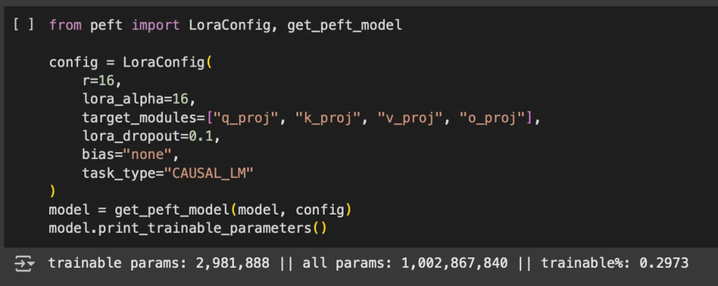 This was fun because I at least once started a training run on all the 1 billion parameters. Seeing the speed of it, I soon realized that something was wrong. To my surprise, I had forgotten to pass the PEFT config to the trainer. It was also fun to see the attention modules to target which in this case was just all – but I am excited to play around with this and get into this deeper.