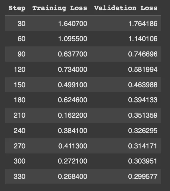 This step was particularly interesting because I was largely exploring new territory. While many concepts related to the training process were familiar, configuring LoRA was entirely new. Fortunately, the Hugging Face docs on Supervised Fine-tuning Trainer (SFT) and Parameter Efficient Fine-tuning (PEFT) were clear and helpful. Youtube videos here and here clarified what was happening behind the scenes, making it easier to get started.