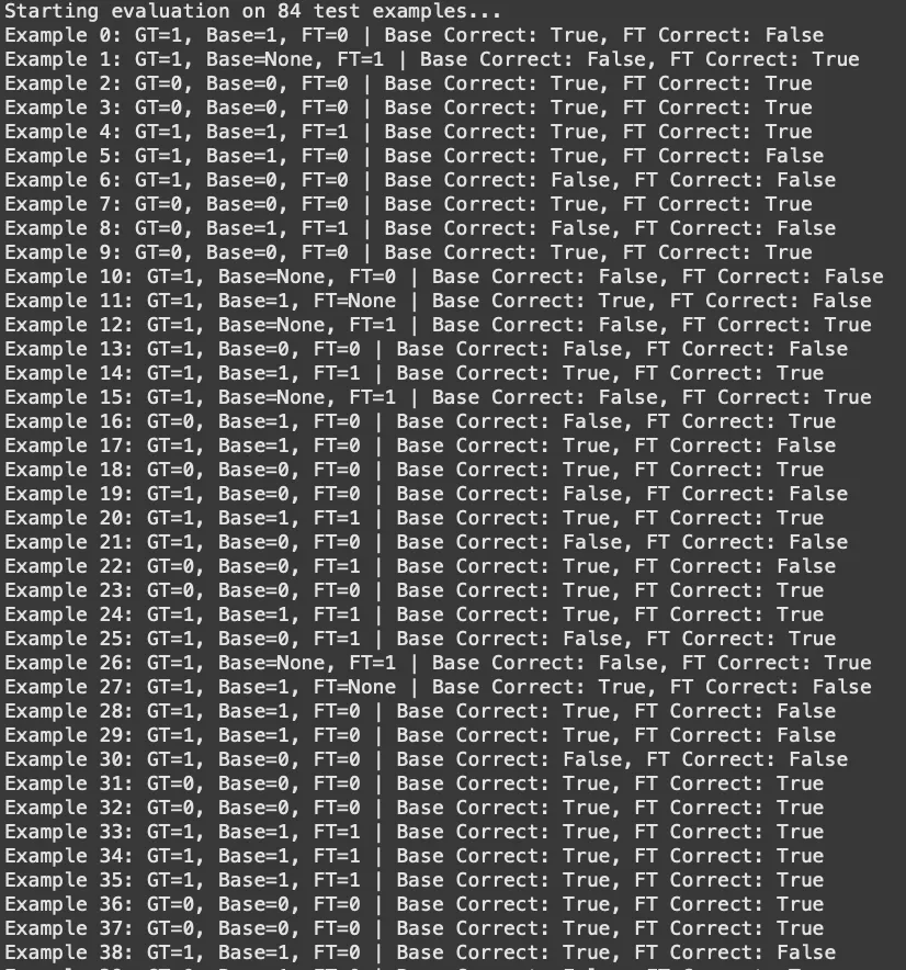 Good learning that fine-tuning doesn’t always boost accuracy, but it can improve structure and consistency. And I got to this learning much faster cause I ran the 84 test set evaluation automatically and could see the results more completely.