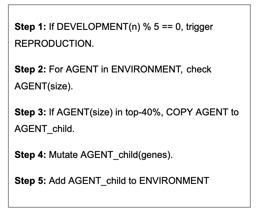 - REPRODUCTION would only be triggered every five rounds of DEVELOPMENT, and only for agents in top 40% size-wise.