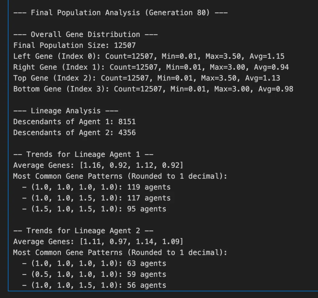 To be able to observe the performance, I added print statements for each DEVELOPMENT run that would show the AGENTS in the ENVIRONMENT, their GENES, direction of movement and SIZE.