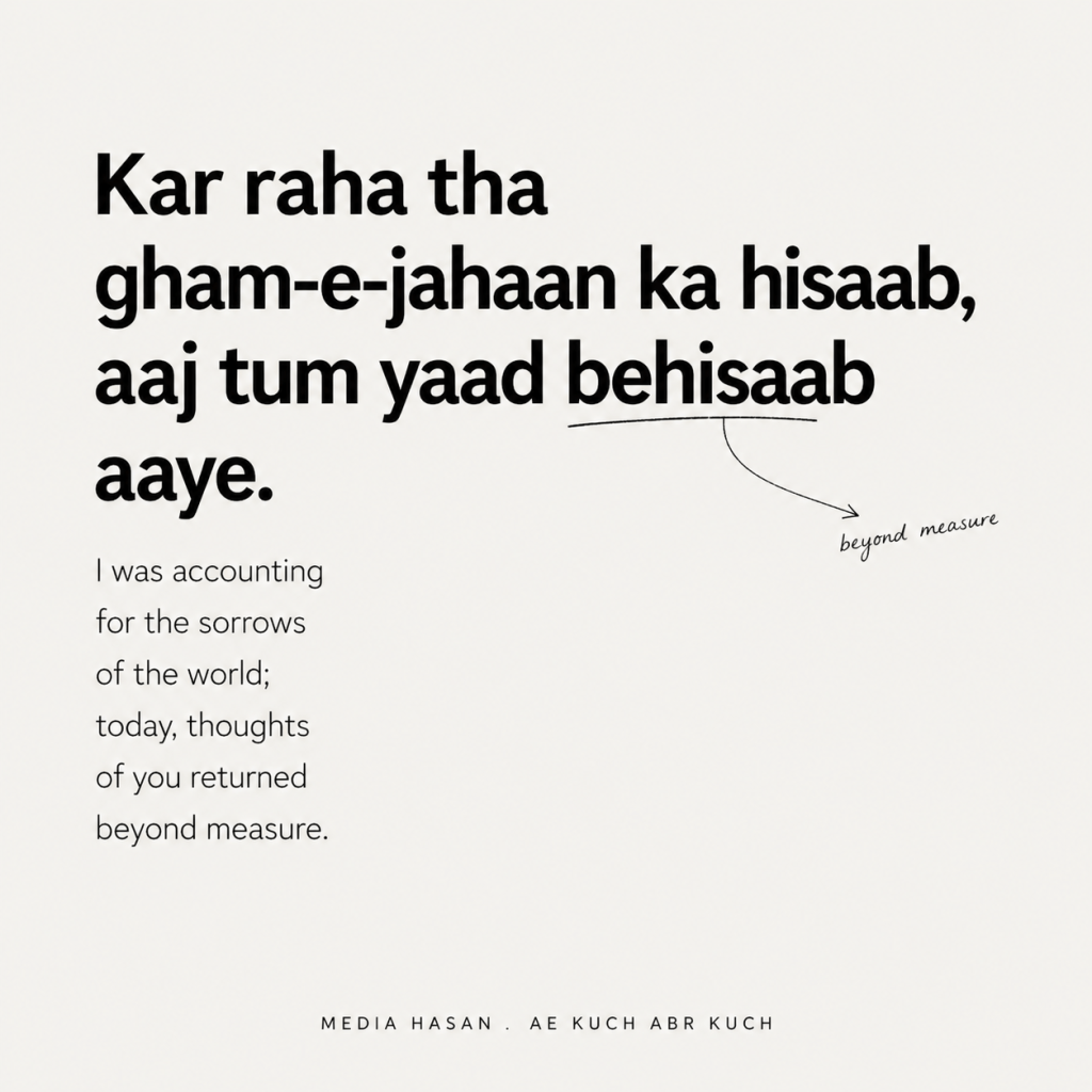 In the original, much of the couplet’s poetic force is in the interplay of ‘hisaab’ and ‘behisaab’. A simple prefix switches the scene from one of the poet bookkeeping universal sorrows, which are still countable, to the poet remembering an absent beloved in a manner which is essentially uncountable/incomputable.